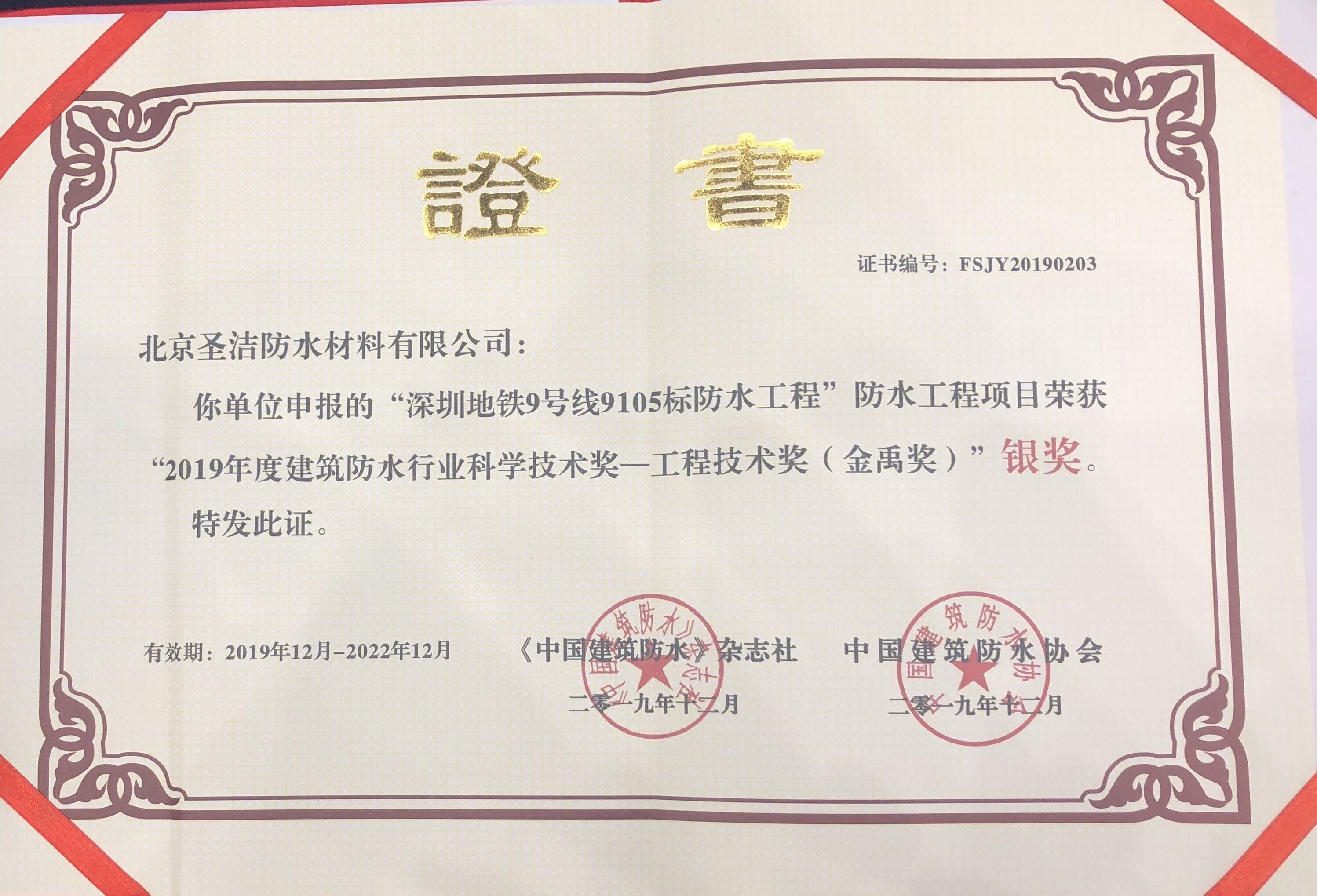 • “深圳地鐵9號線9105標段防水工程”獲