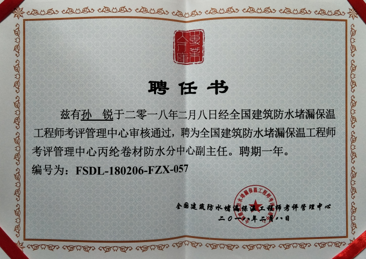 • 孫銳全國建筑防水堵漏保溫工程師考評管理中