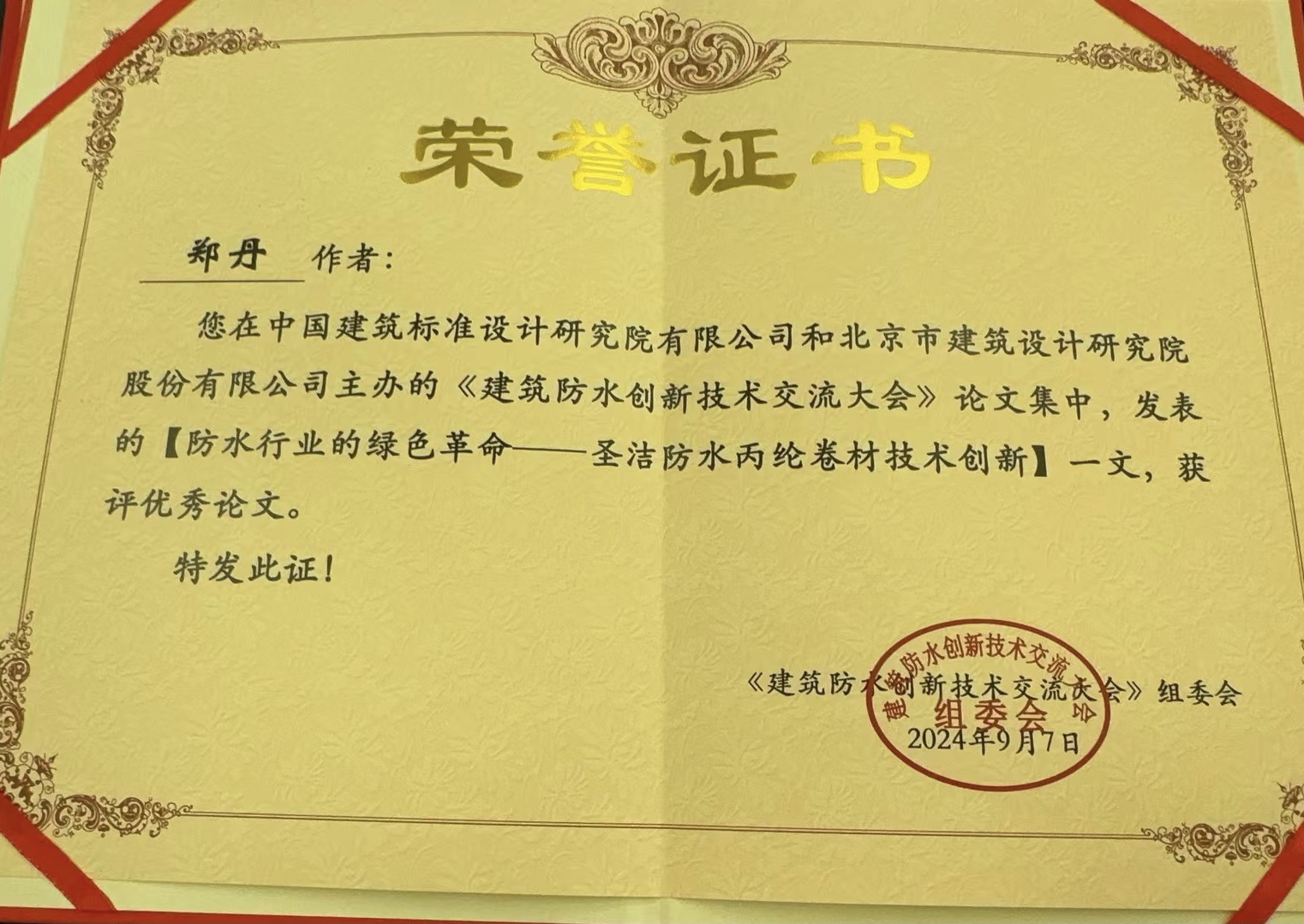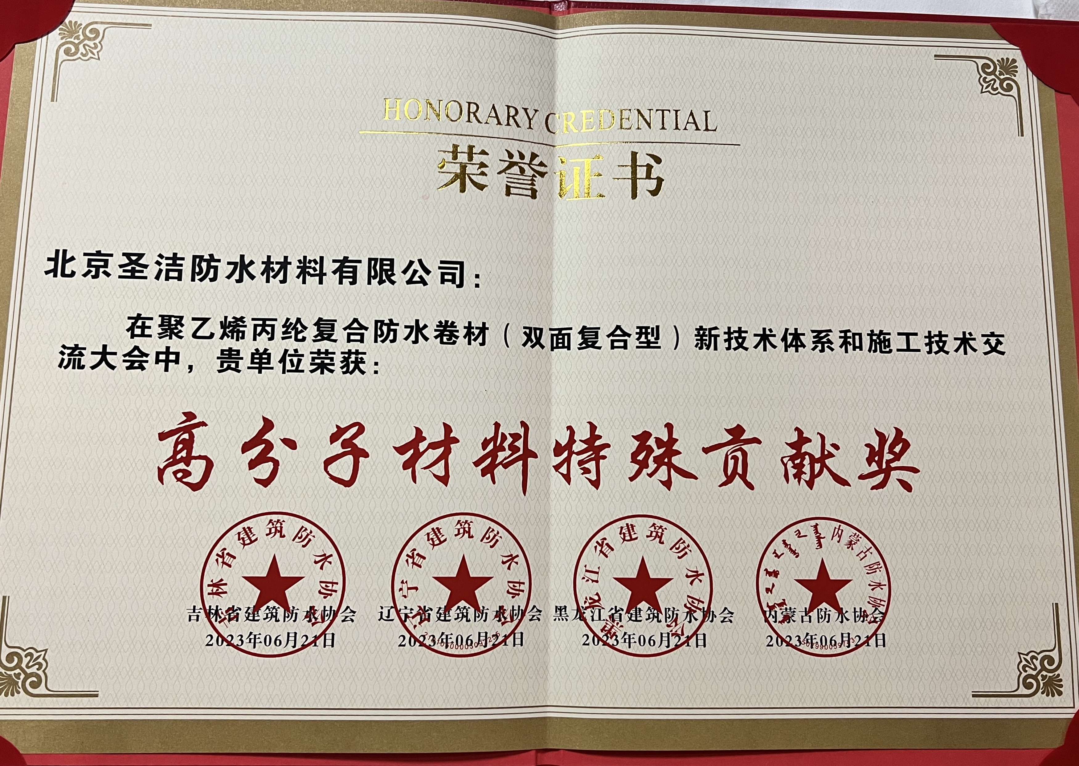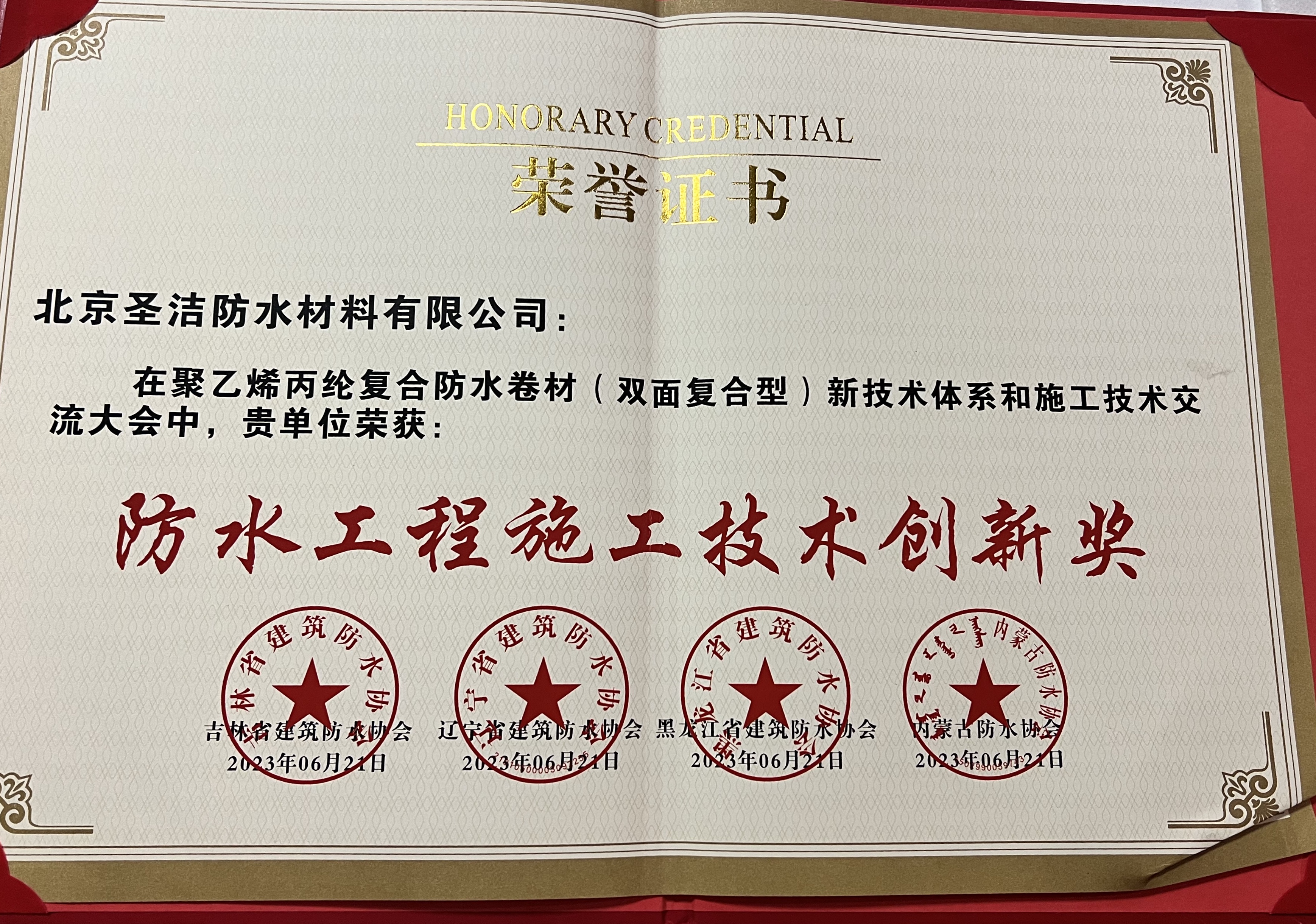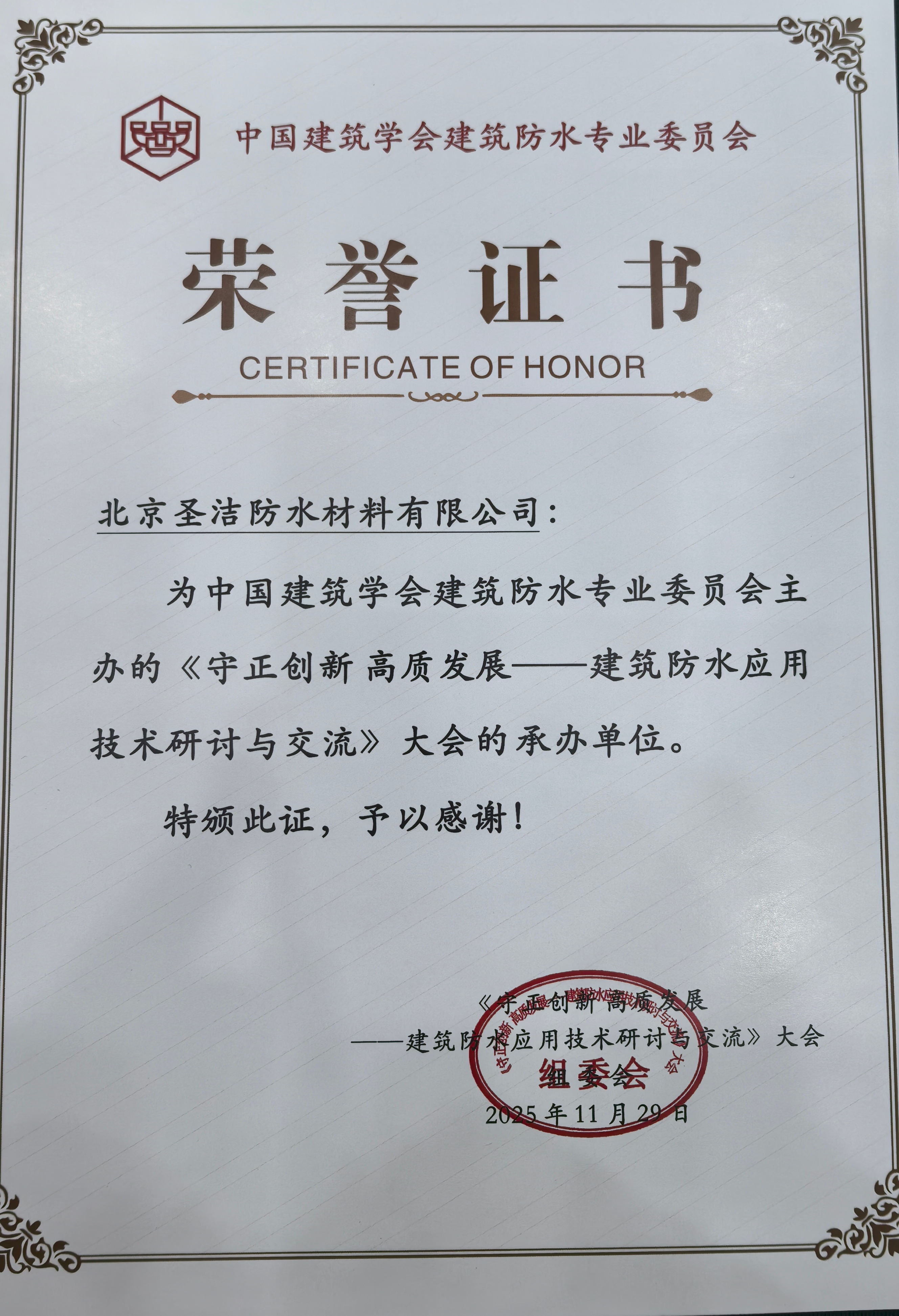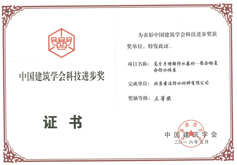 • 中國建筑學會建筑防水學術委員會榮譽證書