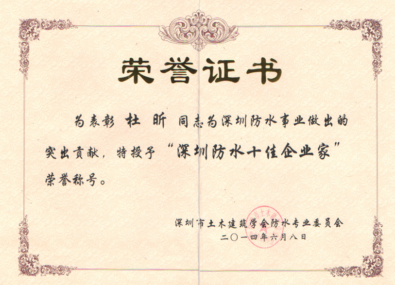 • 杜昕“深圳防水十佳企業家”榮譽證書