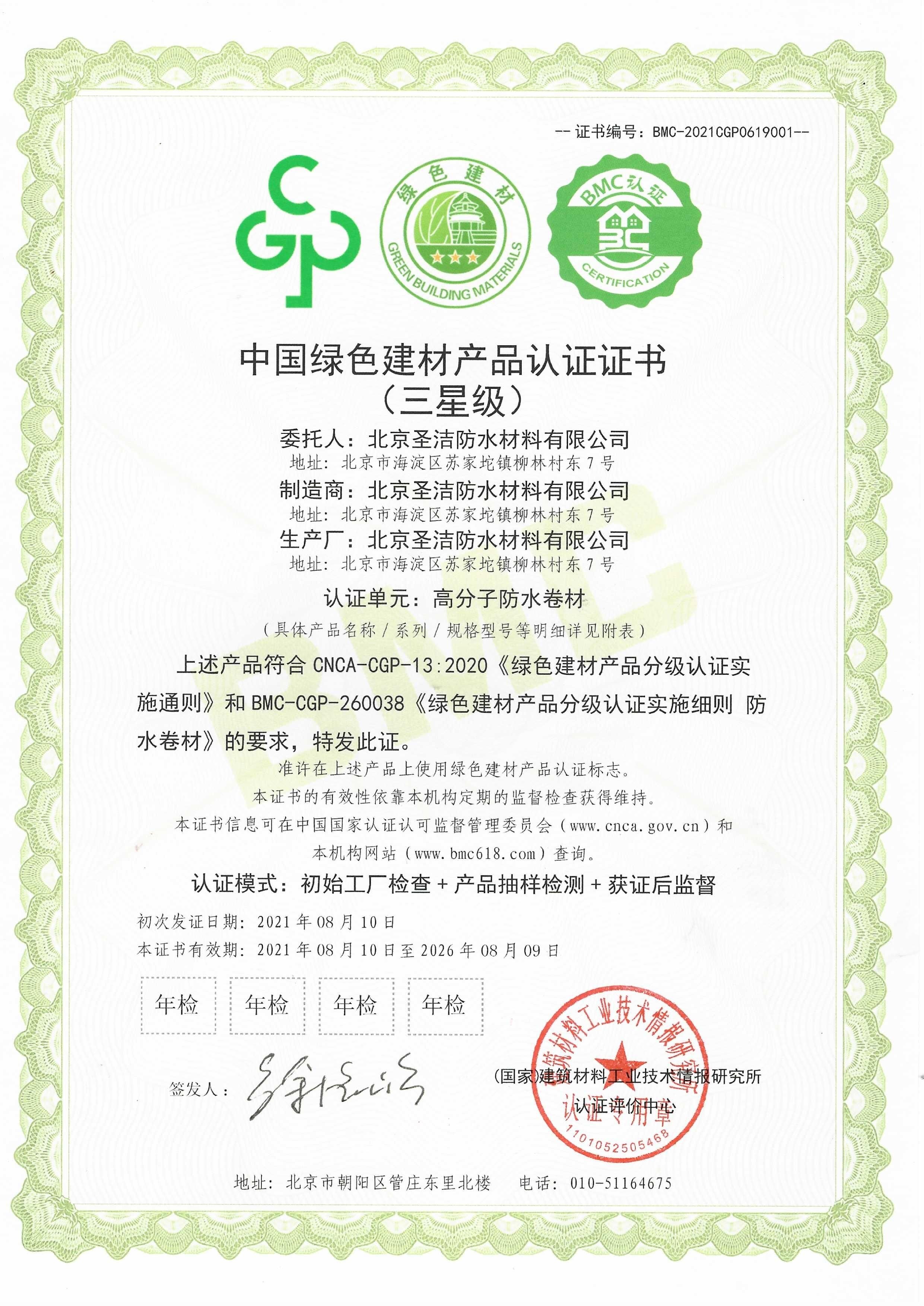• 三星級中國綠色建材產品認證證書
